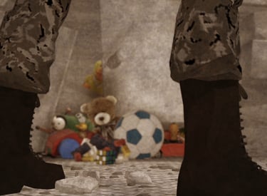 A child plays innocently with a toy weapon and grows older with it as the game slowly mirrors the violence shaping his world.